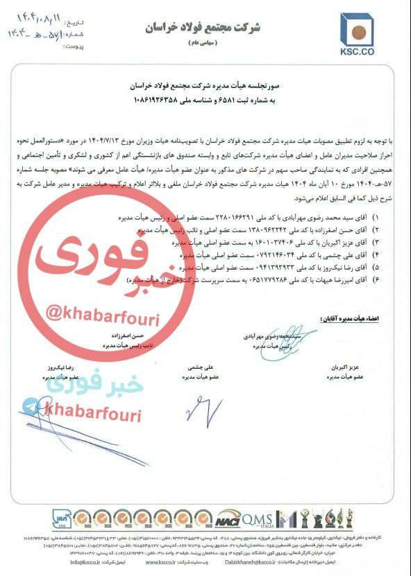 به گزارش خبرنگار رسانه خبری آهننیوز؛ در یکی از بیسابقهترین تحولات مدیریتی صنعت فولاد ایران، هیأتمدیره شرکت فولاد خراسان طی صورتجلسهای رسمی، انتصاب اخیر امیر آذری به عنوان مدیرعامل این شرکت را لغو و تصمیم به ابقای موقت امیررضا هیهات در سمت سرپرست شرکت گرفت.