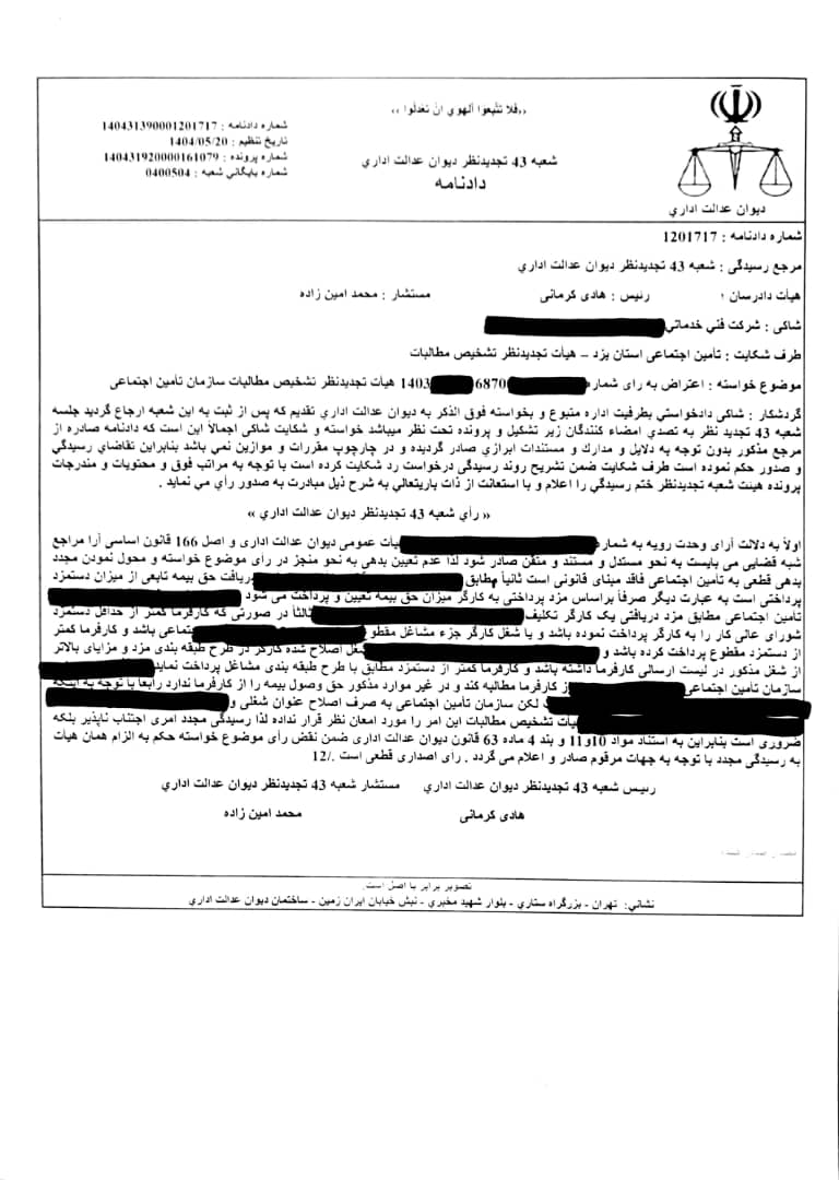 یکی از مخاطبان «آهن‌نیوز» در واکنش به این موضوع، نامه‌ای را که در دیوان عدالت اداری ثبت شده، ارسال کرده است. این نامه نشان می‌دهد برخی شرکت‌ها در معادن استان کرمان، به‌ویژه منطقه بافت، با شکایت و اعتراض به محاسبات جدید تأمین اجتماعی، درگیر پرونده‌های قضایی شده‌اند.