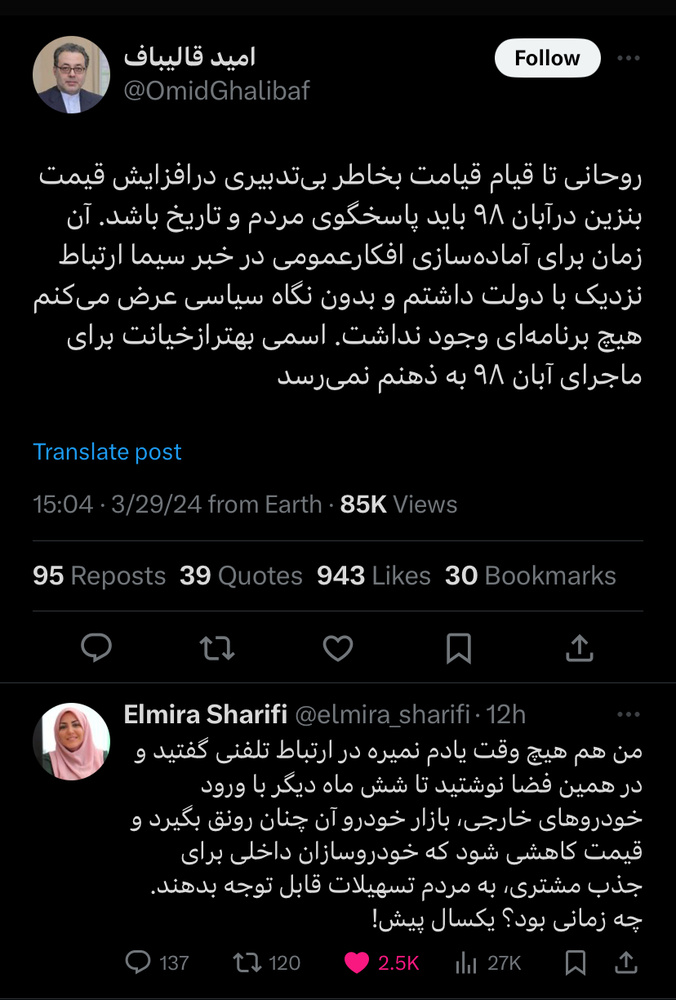 روحانی تا قیام قیامت بخاطر بیتدبیری درافزایش قیمت بنزین درآبان ۹۸ باید پاسخگوی مردم و تاریخ باشد. آن زمان برای آمادهسازی افکارعمومی در خبر سیما ارتباط نزدیک با دولت داشتم و بدون نگاه سیاسی عرض میکنم هیچ برنامهای وجود نداشت. اسمی بهترازخیانت برای ماجرای آبان ۹۸ به ذهنم نمیرسد.