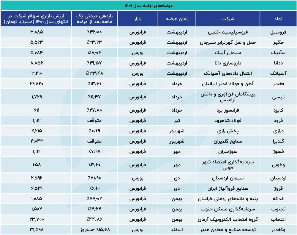خرداد ماه 1401 سهام سه شرکت آهن و فولاد غدیر ایرانیان، پیشگامان فنآوری و دانش آرامیس و فرانسوز یزد در بازار فرابورس ایران عرضه شد. ارزش بازاری سهام فغدیر در انتهای سال به 29 هزار و 820 میلیارد تومان رسید که می توان این عرضه را بزرگترین عرضه اولیه فرابورس در سال 1401 و دومین عرضه اولیه بزرگ سهامی سال دانست. از سوی دیگر کوچکترین عرضه اولیه سال نیز به عرضه سهام کایزد تعلق گرفته که ارزش بازاری آن در انتهای سال 1401 نزدیک به 611 میلیارد تومان بود.
