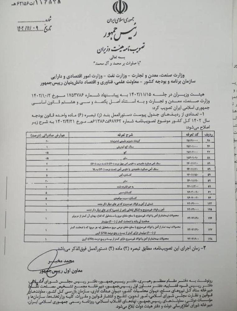 متن نامه وزارت صمت در رابطه با اصلاح عوارض صادراتی: